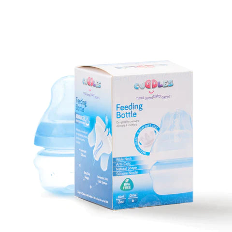 The Cuddles Feeding Bottle in blue, with a compact 60ml capacity, is ideal for newborns and smaller feeding portions. Designed with BPA-free materials, this bottle ensures your baby’s safety while providing a comfortable feeding experience. The soft silicone nipple mimics the feel of breastfeeding, making the transition smoother for both parents and baby.
