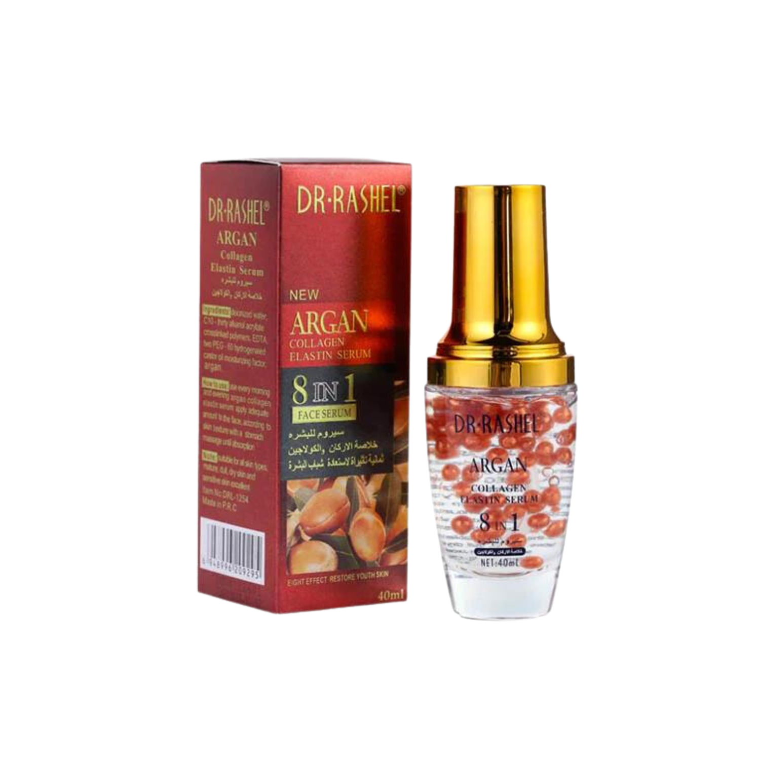 DR.RASHEL New Argan Collagen Elastin Serum is enriched with Moroccan Argan Oil, Collagen, and Elastin proteins that work together to deeply hydrate, reduce fine lines, and restore skin elasticity. This advanced formula boosts natural firmness, promotes smooth texture, and helps fight visible signs of aging while leaving the skin soft, plump, and radiant.