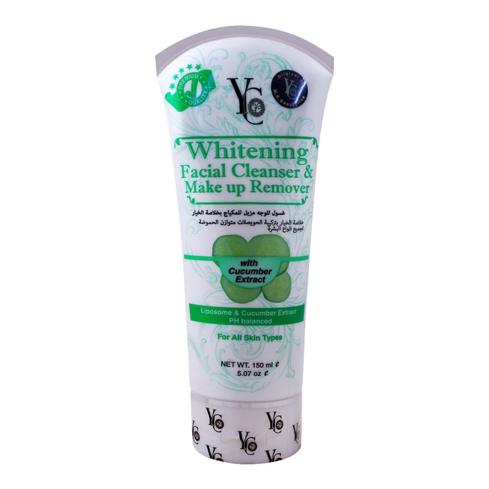 YC Whitening Facial Cleanser 150 ml, makeup remover cleanser, cucumber liposome extracts, glycolic acid exfoliant, honey-milk mini beads, pH-balanced face wash, brightening cleanser, deep pore cleaning, Thai skincare, daily facial cleanser